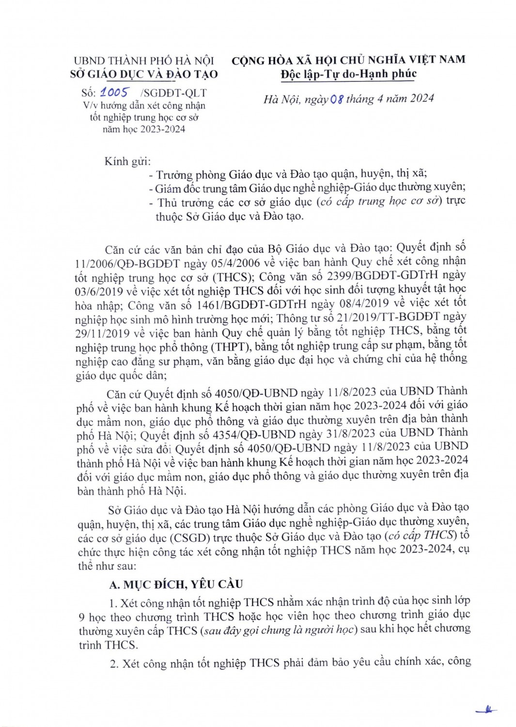 | 7 | Số: 1005/SGDĐT-QLT | 07/04/2024 | Hướng dẫn xét tuyển công nhận tốt nghiệp trung học cơ sở năm học 2023-2024 | |
